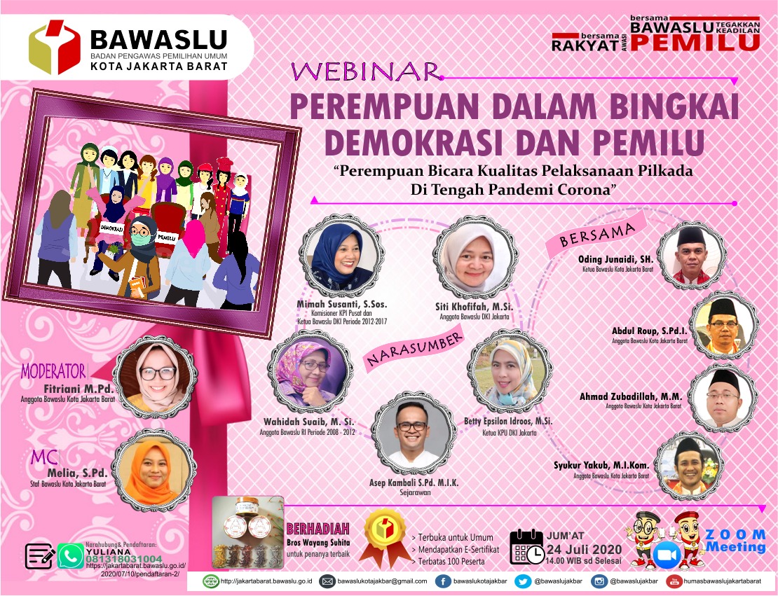 Kegiatan tersebut mengundang peserta dari seluruh wilayah Indonesia. Mahasiswa, aktivis, organisasi-organisasi masayarakat maupun mahasiswa dan seluruh stackeholder Bawaslu berpartisipasi dalam kegiatan tersebut. Bawaslu Jakarta Barat menghadirkan 5 pemateri dalam kegiatan webinar diskusi daring dengan Tema “Perempuan Dalam Bingkai Demokrasi Pemilu” yaitu diantaranya Siti Khofifah, S. Ag. M.Si (Anggota Bawaslu DKI), Betty Epsilon Idroos. M.Si (Ketua KPU DKI), Asep Khambali S.Pd. M.I.K (Sejarawan), Wahidah Suaib M.A. (Anggota Bawaslu RI Periode 2008-2012), Mimah Susanti, S.Sos (Ketua Bawaslu DKI Tahun 2012-2017 & Anggota KPI RI). Kegiatan tersebut di pimpin langsung oleh Fitriani, M.Pd sebagai Moderator (Anggota Bawaslu Jakarta Barat).