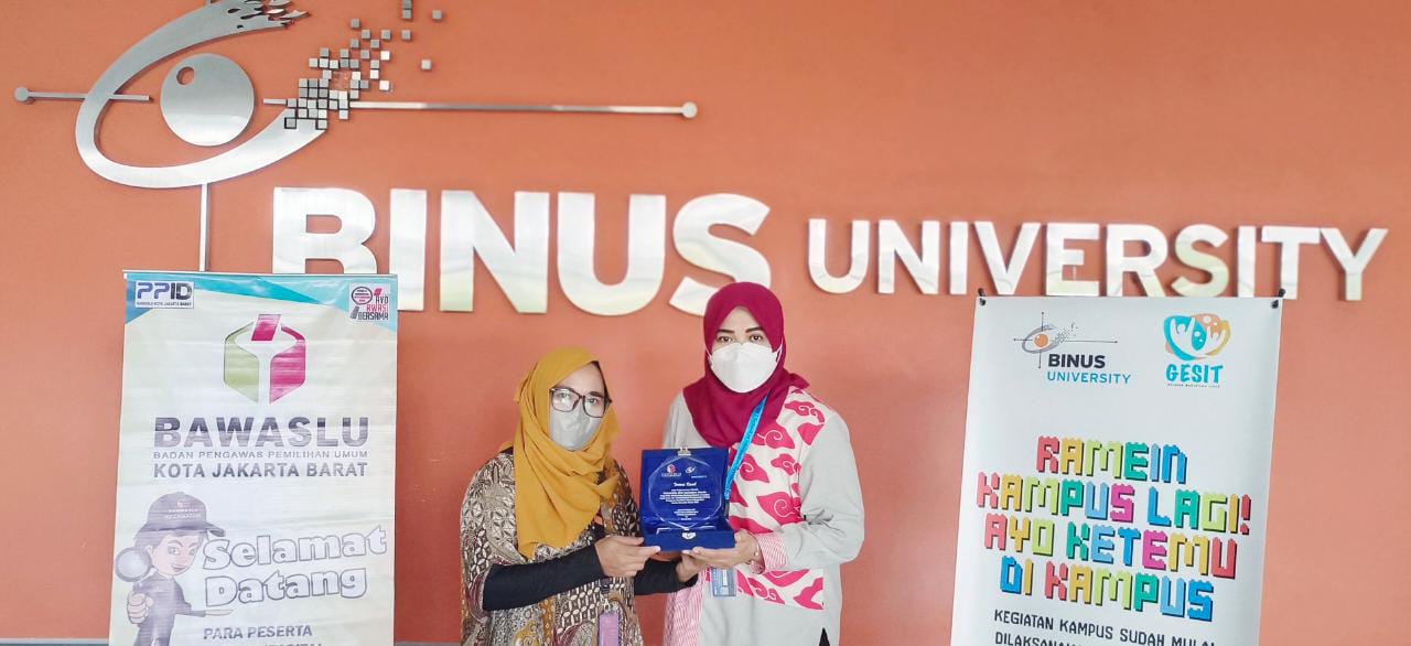 Penyerahan Cinderamata Kepada Universitas Bina Nusantara Oleh Fitriani, M.Pd.