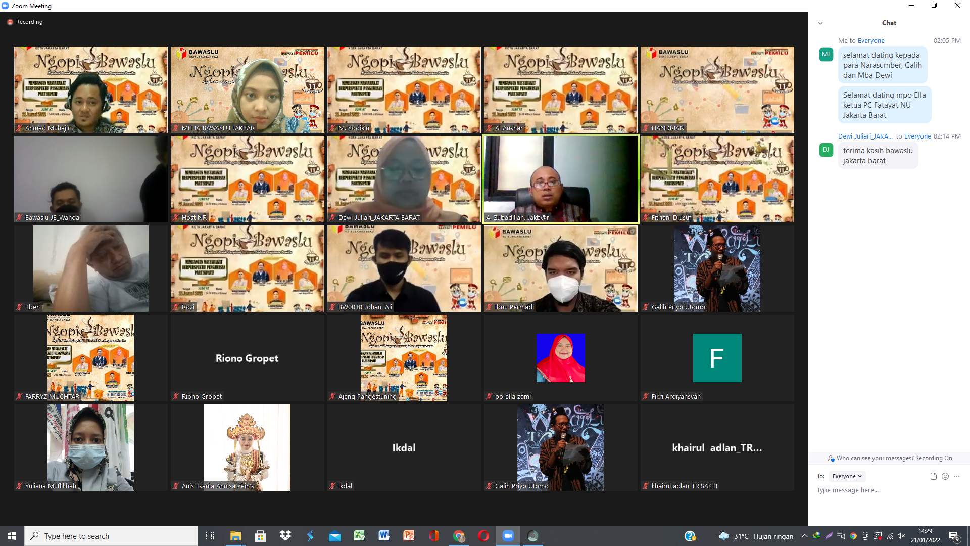 Bawaslu Jakarta Barat,- Sekolah Kader Pengawas Partisipatif (SKPP) merupakan sebuah gerakan bersama Bawaslu dan masyarakat dalam menciptakan pemilu yang berintegritas. Pergerakan yang pesertanya dari kalangan anak muda tersebut diharapkan dapat mentransfer pengetahuan dari pendidikannya saat di SKPP ke lingkungannya. Di awal tahun 2022 ini, Bawaslu Kota Jakarta Barat kembali memulai program unggulannya di tahun 2021 yang sukses menjadi trademark yaitu Ngopi Bawaslu. Bincang-bincang seputar kepemiluan pada tanggal 21 Januari 2022 ini menghadirkan dua narasumber SKPP, yaitu peserta alumni SKPP tahun 2020 yaitu Galih Priyo Utomo dan dan peserta alumni SKPP tahun 2021 yaitu Dewi Juliari.