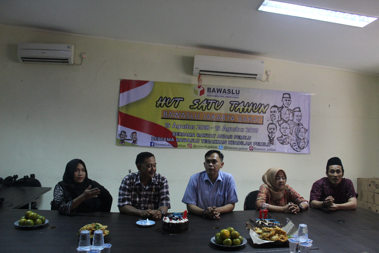 Hari ini (15/8) Bawaslu Kota Administrasi Jakarta Barat memperingati 1 (satu) tahun pelantikan Bawaslu Kabupaten/Kota se-Indonesia. Acara yang digelar di Kantor Sekretariat Bawaslu Kota Administrasi tersebut dihadiri oleh Ketua, Seluruh Anggota, Kepala dan Bendahara Kesekretariatan, dan segenap Staff Bawaslu Kota Administrasi Jakarta Barat.