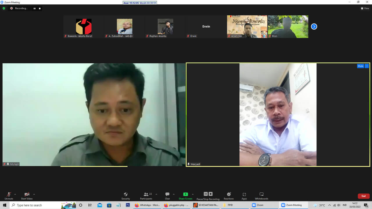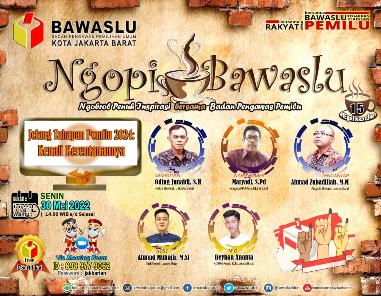 Bawaslu Kota Jakarta Barat - Pada hari Senin tanggal 30 Mei 2022 menggelar kembali Ngobrol Penuh Inspirasi bersama Badan Pengawas Pemilu Kota Jakarta Barat atau yang tidak asing lagi dengan sebutan Ngopi Bawaslu dengan tema “Jelang Tahapan Pemilu 2024 : Kenali Kerentanannya”.Kegiatan yang menjadi salah satu aktifitas rutin dilakukan setiap bulannya selalu memberikan tema-tema yang memang memberikan informasi sangat bermanfaat bagi seluruh peserta yang menghadiri kegiatan tersebut, biarpun sampai sekarang masih dilakukan melalui aplikasi virtual dengan zoom meeting.