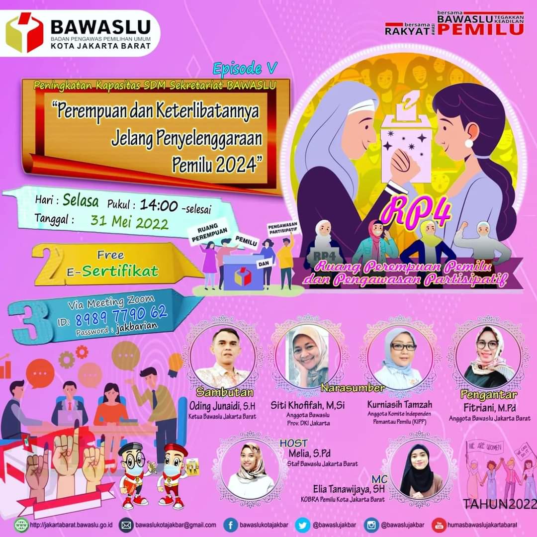 Keterlibatan perempuan untuk menjadi penyelenggara pemilu tentunya menjadi hal yang penting untuk terwujudnya sistem demokrasi yang lebih inklusif dengan menghadirkan perempuan secara langsung. Sebab, laki-laki yang hanya memiliki perspektif gender saja itu tidaklah cukup. Adanya dasar hukum pelibatan perempuan dalam menjaga demokrasi termaktub dalam Undang-Undang No. 7 Tahun 2017 Tentang Pemilihan Umum. Didalamnya memperhatikan keterwakilan perempuan sekurang-kurangnya 30% (tiga puluh persen Perlu adanya diskusi lebih lanjut mengenai keterlibatan dan kesiapan perempuan dalam ranah pemilu. Terlebih kedepan akan ada Pemilu 2024 yang tentunya harus di maksimalkan dalam peningkatan kehadiran dan kesiapan perempuan untuk terlibat didalamnya. Dengan ini Bawaslu Kota Jakarta Barat mengadakan kegiatan "Ruang Perempuan Pemilu dan Pengawasan Partisipatif (RP4) Ep. 5 dengan Tema "Perempuan dan Keterlibatannya Jelang Penyelenggaraan Pemilu 2024".