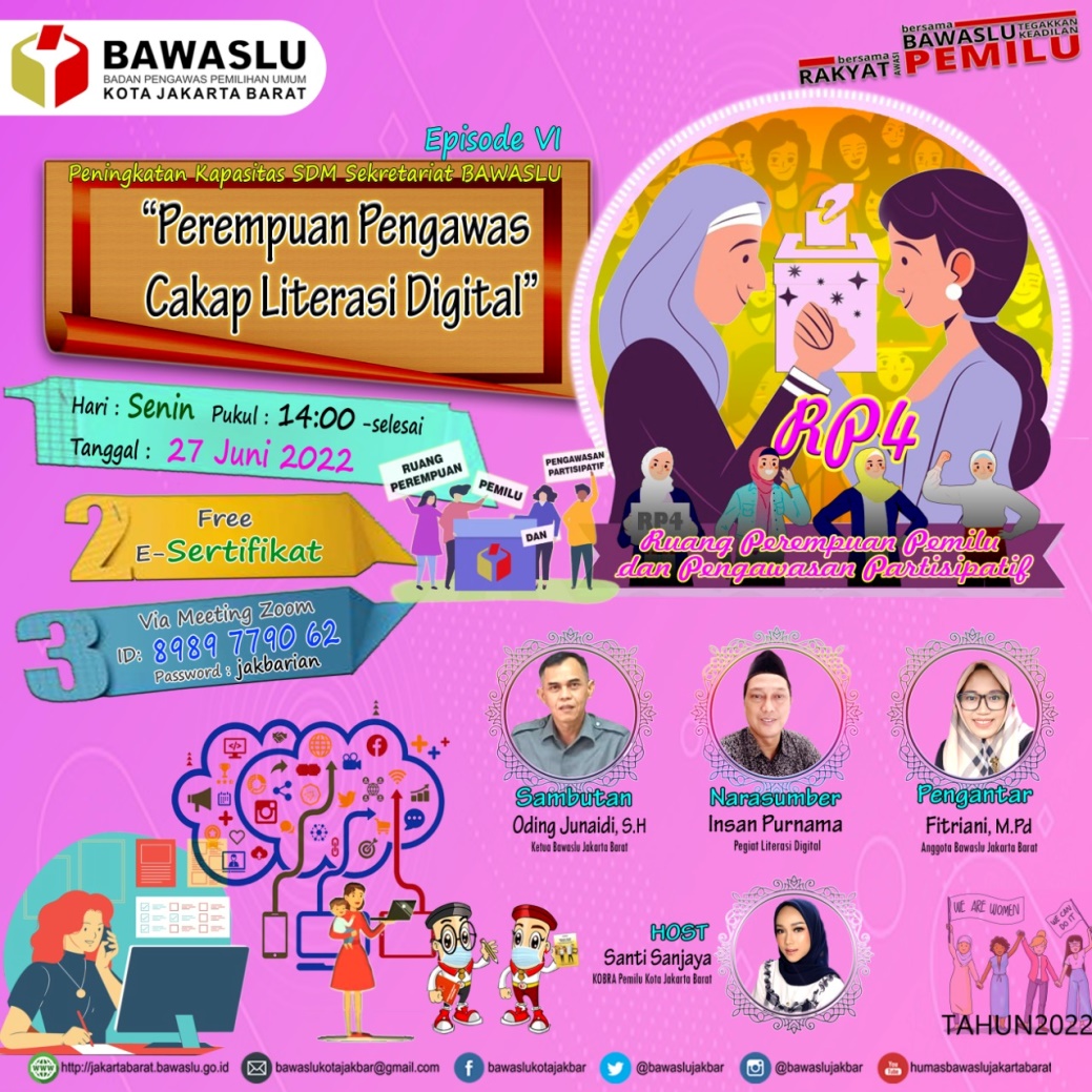 Berkaca pada latar belakang tersebut, Bawaslu Jakarta Barat mengadakan diskusi dalam bentuk Ruang Perempuan Pemilu dan Pengawasan Partisipatif (RP4) Episode ke-6 dengan tema "Perempuan Pengawas Cakap Literasi Digital". Selain dihadiri oleh kalangan internal Bawaslu, kegiatan ini juga melibatkan pegiat pemilu, kobra pemilu serta kalangan mahasiswa.
