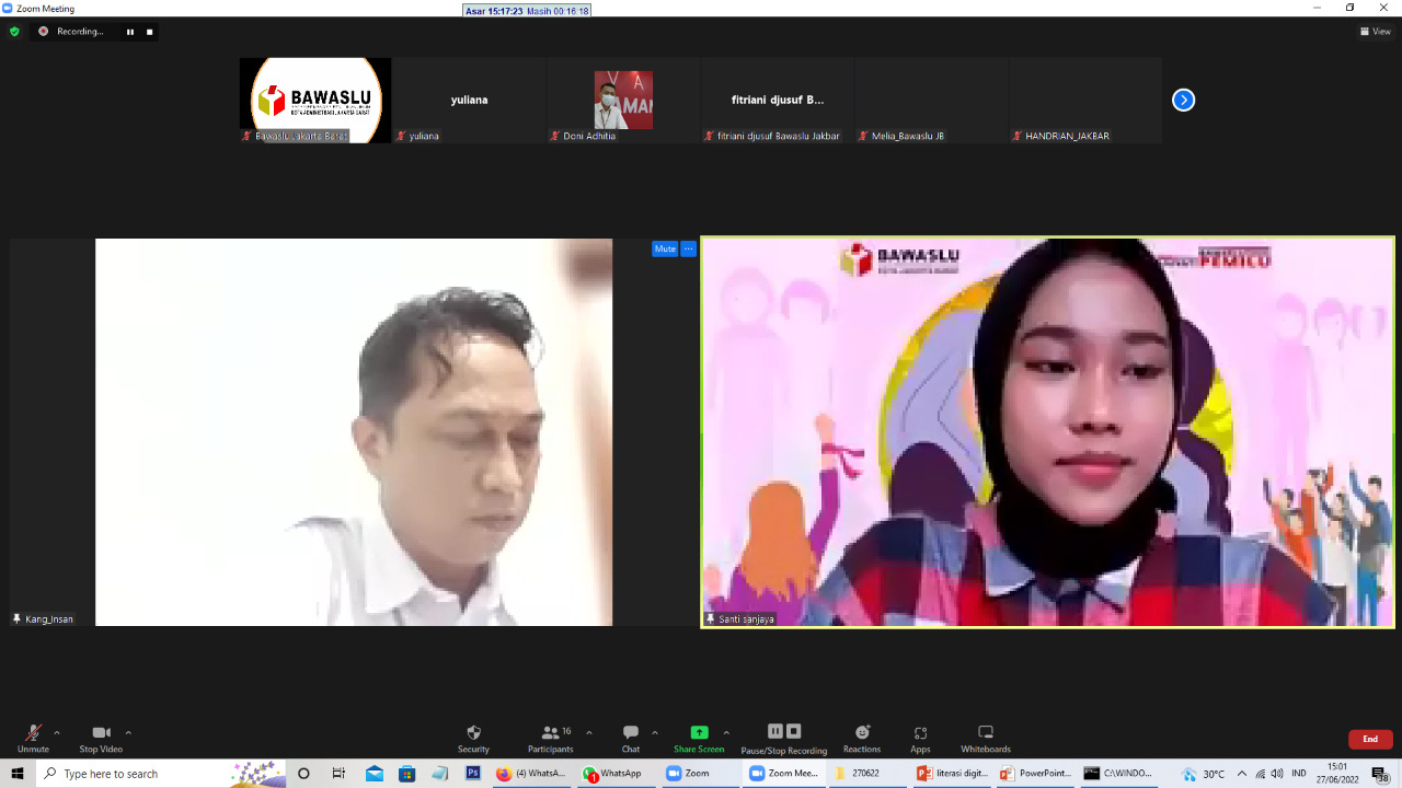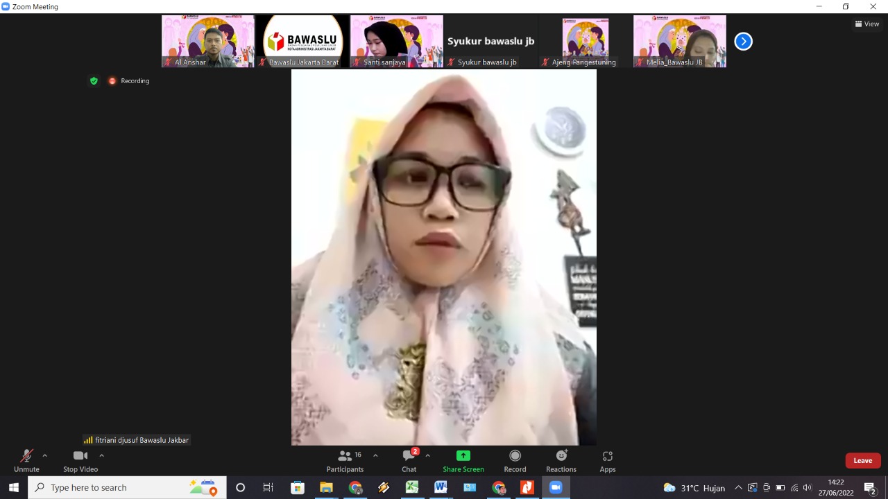 Kordiv SDM dan Organisasi Bawaslu Jakarta Barat, Fitriani menyampaikan dalam pengantar diskusi terkait perlunya peningkatan kapasitas SDM pengawas pemilu khususnya perempuan yang seringkali menjadi objek hoaks karena dianggap lemah dalam mengakses informasi.