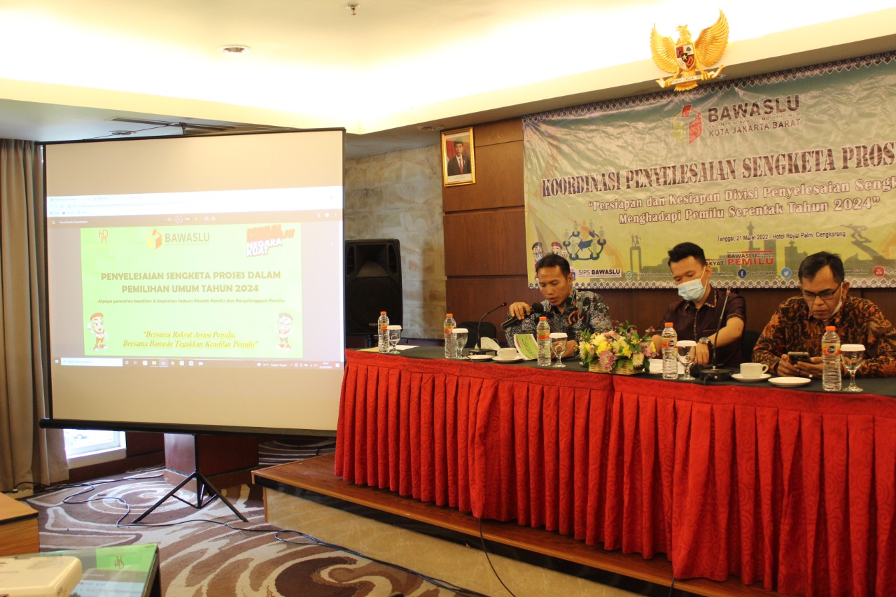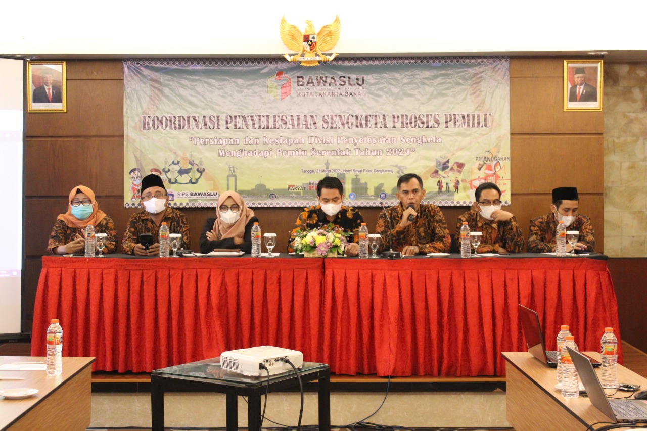 Bawaslu Kota Jakarta Barat,- Badan Pengawas Pemilihan Umum (Bawaslu) Kota Jakarta Barat melaksanakan Rapat Koordinasi Penyelesaian Sengketa Proses yang pada 21 Maret 2022 bertempat di Hotel Royal Plm Cengkareng, yang dimana rapat tersebut dihadiri oleh Anggota Bawaslu Provinsi DKI Jakarta selaku Koordinator Divisi Penyelesaian Sengketa (Mahyudin), Ketua dan Anggota Bawaslu Kota Jakarta Barat, Koordiantor sekretariat dan Bendahara Bawaslu Kota Jakarta Barat, Staf tekhnis Bawaslu Kota Jakarta Barat, Staf Divisi Penyelesaian Sengketa Kabupaten/Kota se-Provinsi DKI Jakarta, Serta Unsur-unsur organisasi Kemahasiswaan.