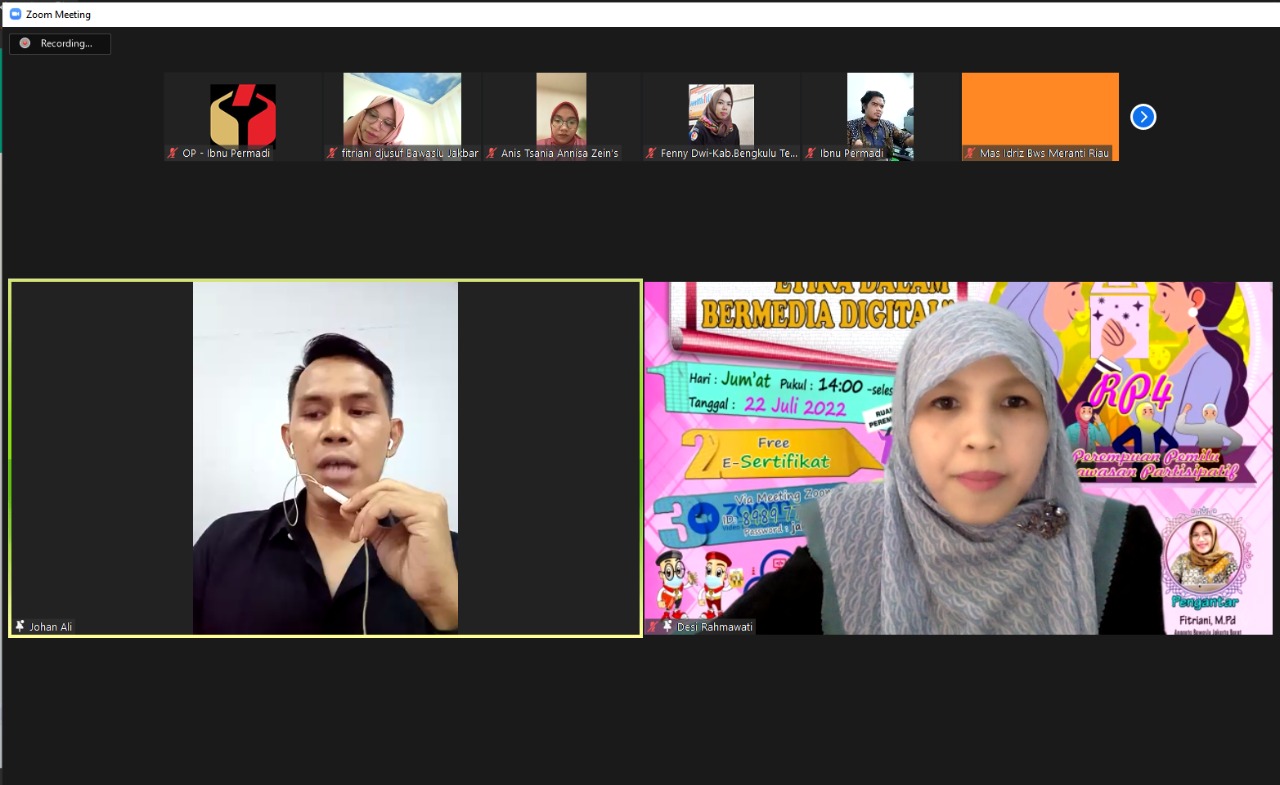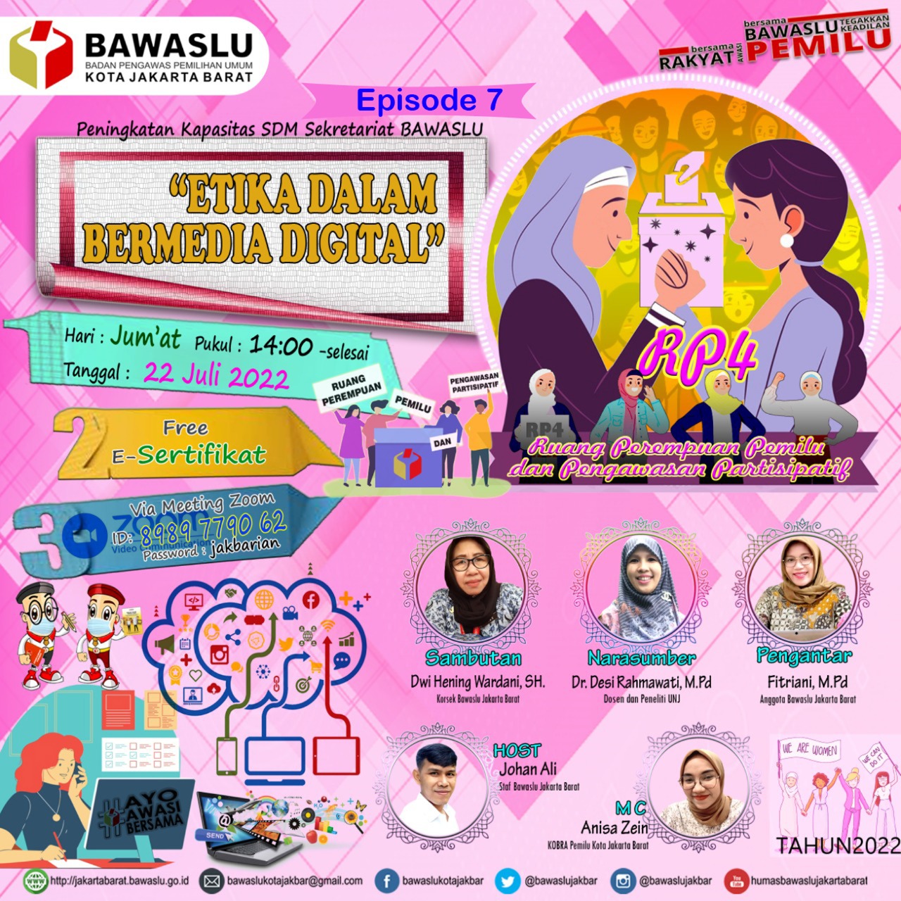 Bawaslu Kota Jakarta Barat aktif dalam mengkampanyekan pentingnya literasi bermedia sosial lewat Ruang Perempuan Pemilu dan Pengawasan Partisipatif Episode 6 dengan tema Etika dalam Bermedia Digital. Acara yang diadakan pada Kamis 22 Juli 2022 ini menghadirkan pemateri Desi Rahmawati selaku dosen dan peneliti Universitas Negeri Jakarta. Desi menjelaskan terkait etika dalam bermedia sosial dengan penjelasan yang mudah dipahami. Beliau menerangkan semakin giat seseorang belajar mencari kebenaran informasi maka akan semakin besar pilihannya untuk membagikannya ke orang lain atau tidak. Mencegah hoaks tidak dapat dilakukan oleh satu individu namun juga berbagai kalangan agar dapat terhenti.