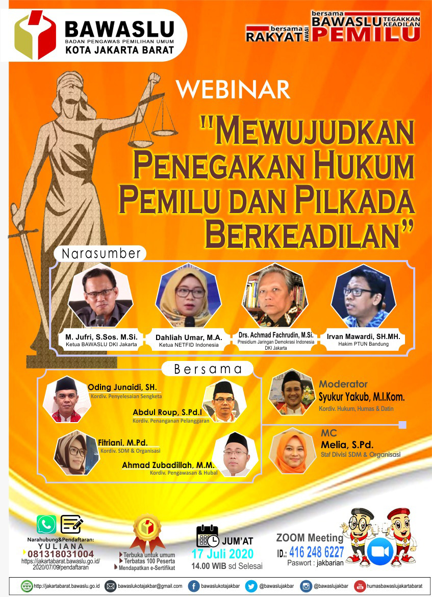 Jakarta - Jumat, 17 Juli 2020 Bawaslu Kota Administrasi Jakarta Barat mengadakan acara Webinar Bedah Buku dengan tema “Mewujudkan Penegakan Hukum Pemilu dan Pilkada Berkeadilan” melalui aplikasi Daring Zoom yang di mulai pada pukul 14.00 WIB. Pada Rapat tersebut dihadiri oleh narasumber yang berasal dari Bawaslu Provinsi DKI Jakarta, yaitu Ketua Bawaslu DKI Jakarta M.Jufri M.Si , Ketua NETFID Indonesia yaitu Dahlia Umar M.A, Predisium Jaringan Demokrasi Indonesia DKI Jakarta yaitu Achmad Fachrudin M.si dan Hakim PTUN Bandung yaitu Irvan Marwadi MH . Acara ini juga dipesertai oleh berbagai bagian di wilayah Bawaslu se- Provinsi DKI Jakarta, KPU, Mahasiswa dan Unsur Masyarakat dan serta acara tersebut dipandu oleh Syukur Yakub M.Ikom selaku Anggota Bawaslu Kota Jakarta Barat.
