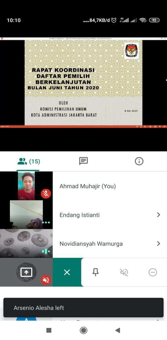Jakarta, Rabu tanggal 8 Juli 2020 Pukul 10.00 WIB Bawaslu Kota Jakarta Barat menghadiri undangan rapat virtual koordinasi pemutakhiran data pemilih berkelanjutan bulan Juni 2020 yang diselenggarakan oleh KPU Kota Jakarta Barat secara daring melalui google meet. Kegiatan ini juga dihadiri oleh stakeholder lainnya seperti KPU Provinsi DKI Jakarta dan Sudin Jakarta Barat.