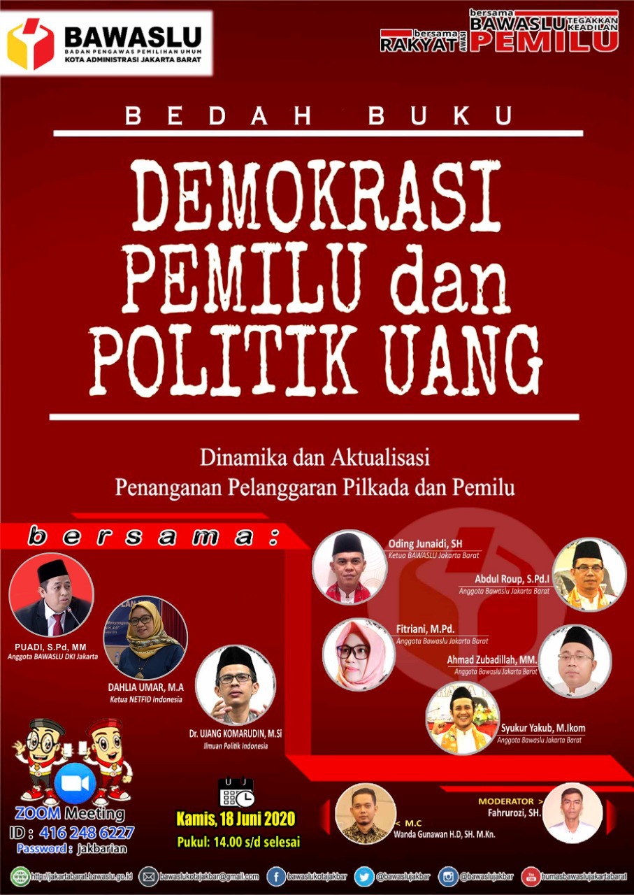 Jakarta - Kamis, 18 Juni 2020 Bawaslu Kota Administrasi Jakarta Barat melakukan kembali bedah buku yang berjudul ”Demokrasi, Pemilu dan Politik Uang”. Buku yang merupakan karya dari Puadi, S.Pd, MM salah satu Anggota Bawaslu Provinsi DKI Jakarta menjadi topik pembedahan buku yang dilaksanakan oleh Bawaslu Kota Adminitrasi Jakarta Barat melalui aplikasi Daring Zoom yang dimulai pada pukul 14.00 WIB.