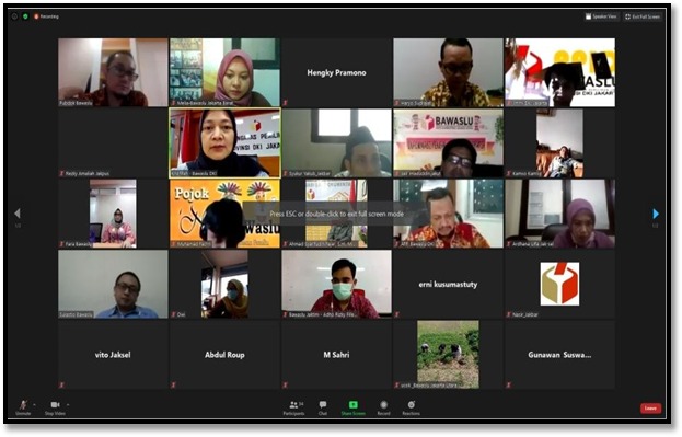 Jakarta - Kamis, 18 Juni 2020 Anggota Bawaslu Kota Administrasi Jakarta Barat mengikuti “Rapat Daring Sosialisasi Implementasi Keterbukaan Informasi Publik berdasarkan Perbawaslu 10 Tahun 2019 dan Perki Pemilu” melalui aplikasi Daring Zoom yang di mulai pada pukul 14.00 WIB. Pada Rapat tersebut dihadiri oleh 3 narasumber yang berasal dari Bawaslu Republik Indonesia, yaitu Kepala Bagian (Kabag) Humas dan Hubal dengan Hengky Pramono, Tenaga Ahli Humas dengan Sulastio dan Kepala sub Bagian (Kasubag) Publikasi dan Dokumentasi dengan Haryo Sudrajat. Rapat ini juga dipesertai oleh berbagai bagian di wilayah Bawaslu se- Provinsi DKI Jakarta yang membidangi divisi Pejabat Pengelola Informasi dan Dokumentasi (PPID).