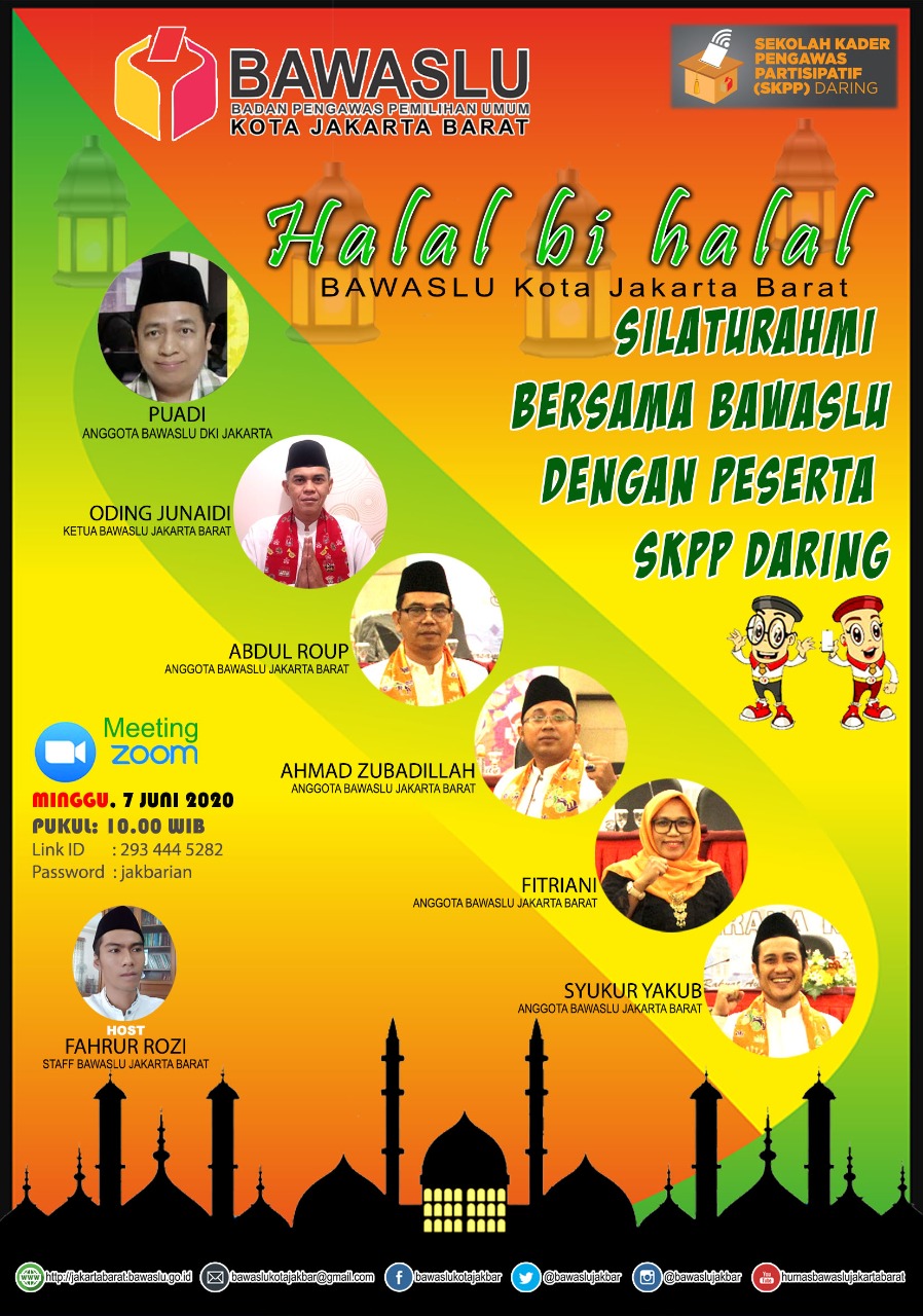Bawaslu Kota Jakarta Barat melaksanakan silaturahmi secara virtual dalam rangka hari raya Idul Fitri 1441 H bersama seluruh peserta SKPP Daring. acara tersebut dihadiri oleh Puadi, Anggota Bawaslu Provinsi DKI Jakarta dan tentunya jajaran Ketua dan anggota Bawaslu Kota Adm. Jakarta Barat. Dalam kesempatan tersebut Puadi menyampaikan kepada seluruh peserta SKPP Daring agar mempersiapkan diri dalam jangka pendek agar lolos skpp (sekolah kader pengawas pemilu) dan jangka panjangnya dapat menjadi salah satu garda terdepan untuk mengawal jalannya demokrasi.